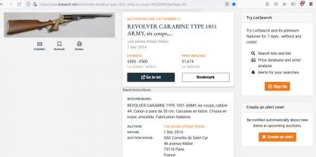 Arme révolver carabine poudre boire COLT PIETTA TYPE 1851 Reb Nord reborn NAVY 44 COMMÉMORATIF 12" RNC44 cal 44 catégorie D2 avec crosse revolving en bois de noyer et laiton de tir sportif mesurant en totalité avec la crosse montée 785 mm, l'ensemble en très bon état.